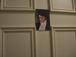 No banheiro das mulheres temos a foto de Elizabeth Bennett . No dos homens, a de Mr. Darcy , lol. ( Os personagens principais do romance mais famoso de J.A. : 'Pride&Prejudice' ( Orgulho e Preconceito).